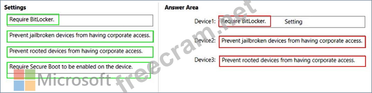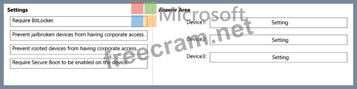 Which compliance policy setting should you configure for each device? To answer, drag the appropriate settings to the correct devices. Each setting may be used once, more than once, or not at all. You may need to drag the split bar between panes or scroll to view content.