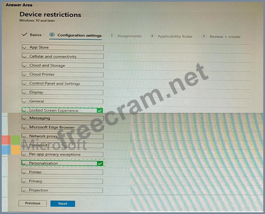 Which two settings should you configure in the Device restrictions configuration profile? To answer, select the appropriate settings in the answer area.
