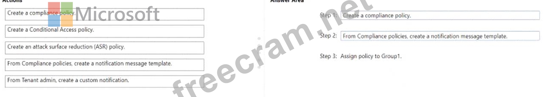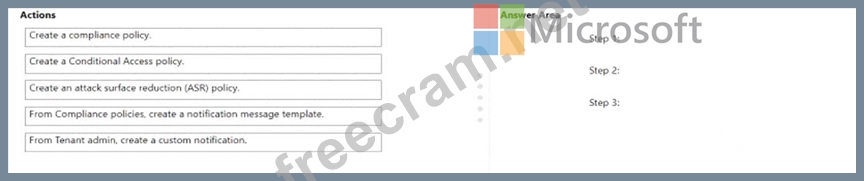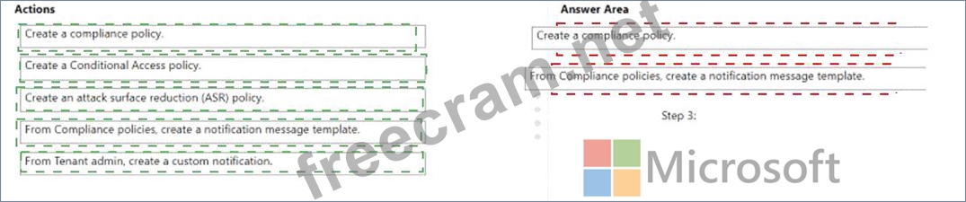 You need to ensure that end users and Intune administrators receive an email message when an Android device does not have an up-to-date security provider Which actions should you perform from the Microsoft Intune admin center in sequence? To answer, drag the appropriate actions to the correct order. Each action may be used once, more than once, or not at all. You may need to drag the split bar between panes or scroll to view content.