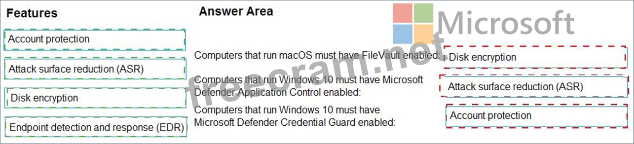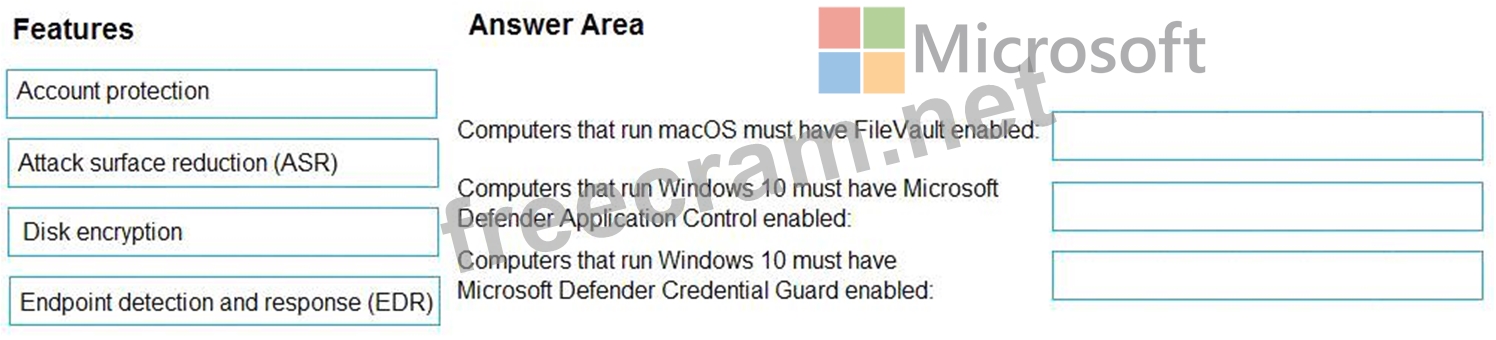 Which Endpoint security feature should you use for each requirement? To answer, drag the appropriate features to the correct requirements. Each feature may be used once, more than once, or not at all. You may need to drag the split bar between panes or scroll to view content.