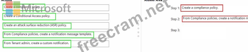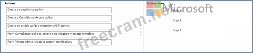 You need to ensure that end users and Intune administrators receive an email message when an Android device does not have an up-to-date security provider Which actions should you perform from the Microsoft Intune admin center in sequence? To answer, drag the appropriate actions to the correct order. Each action may be used once, more than once, or not at all. You may need to drag the split bar between panes or scroll to view content.
