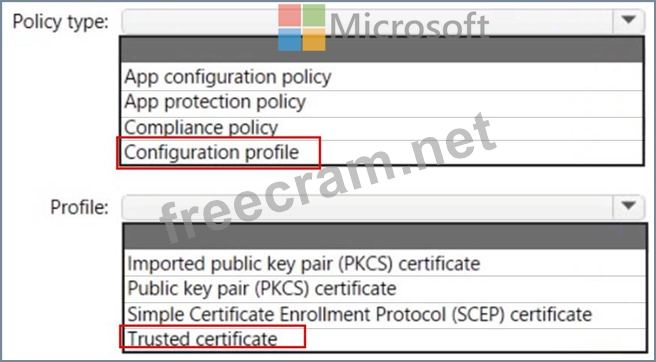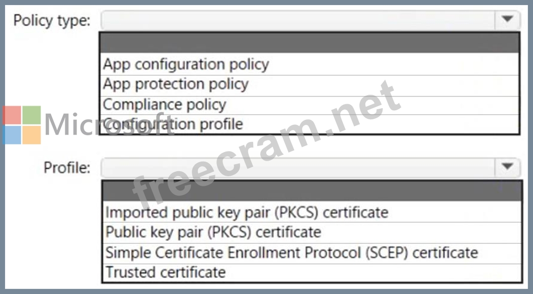 Which type of Intune policy and profile should you use? To answer, select the appropriate options in the answer area.