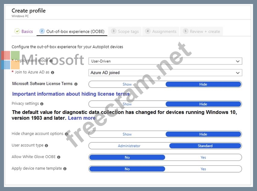 You are creating a Windows Autopilot deployment profile named Profile1 as shown in the following exhibit.