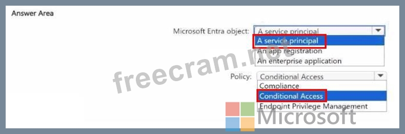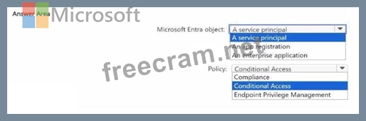 Which type of Microsoft Entra object should you create, and which type of policy should you configure7 To answer, select the appropriate options in the answer area.