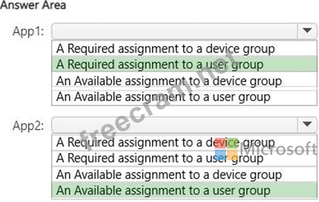 Which assignment should you configure for each app? To answer, select the appropriate options in the answer area.