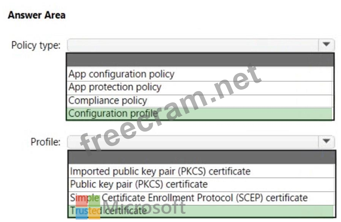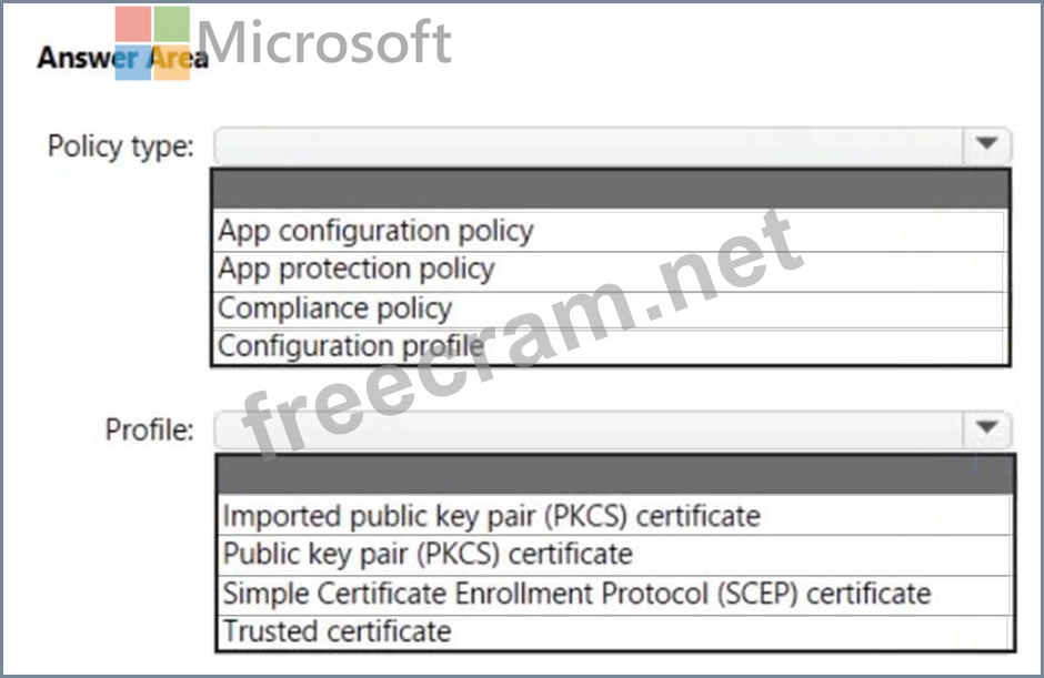 Which type of Intune policy and profile should you use? To answer, select the appropriate options in the answer area.