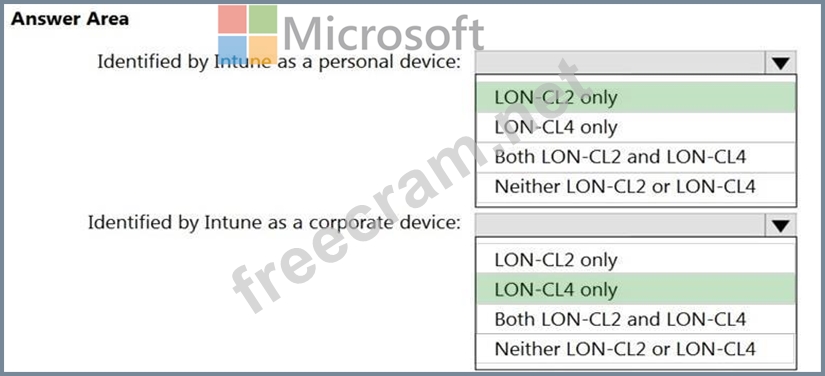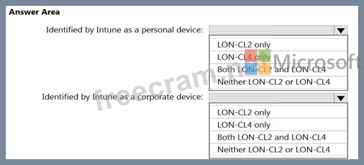 You have a Microsoft 365 tenant that uses Microsoft Intune to manage personal and corporate devices. The tenant contains three Windows 10 devices as shown in the following exhibit.