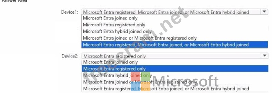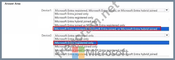 Which Microsoft Entra join type can each device use? To answer, select the appropriate options in the answer are a. NOTE: Each correct selection is worth one point.