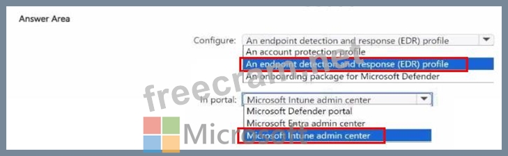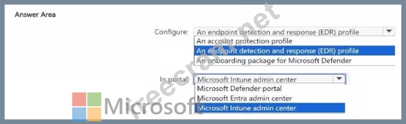 You need to ensure that when a device is enrolled in Intune, the device is onboarded automatically to Defender for Endpoint What should you configure, and which portal should you use? To answer, select the appropriate options in the answer area NOTE: Each correct selection is worth one point.