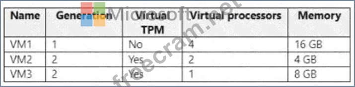 You have a Hyper-V host. The host contains virtual machines that run Windows 10 as shown in following table.