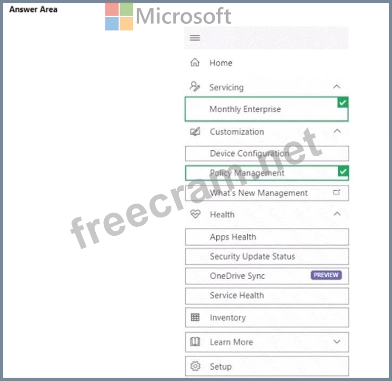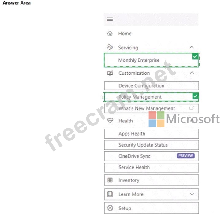 Which two settings should you configure in the Microsoft 365 Apps admin center? To answer, select the appropriate settings in the answer area.