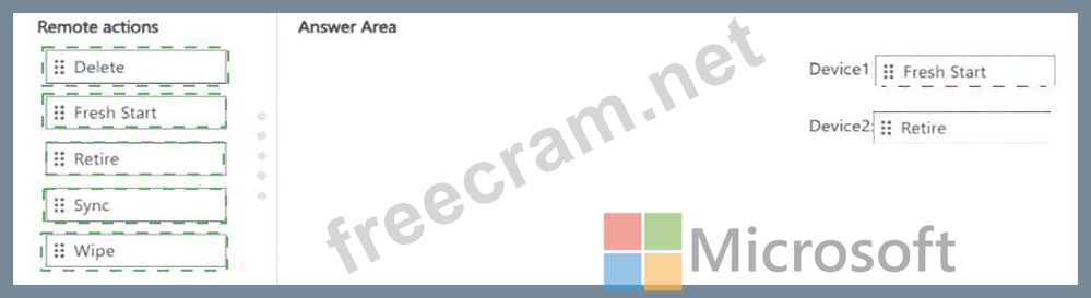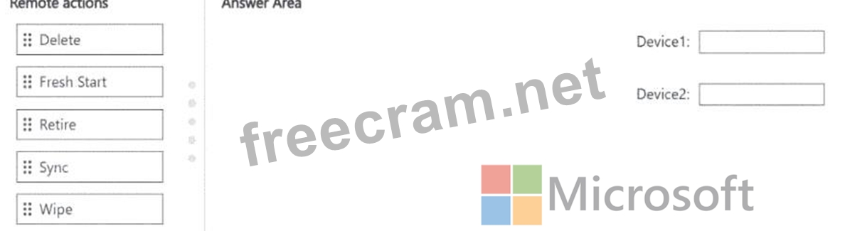 Which remote action should you use on each device? To answer, drag the appropriate remote actions to the correct devices. Each remote action may be used once, more than once, or not at all. You may need to drag the split bar between panes or scroll to view content.