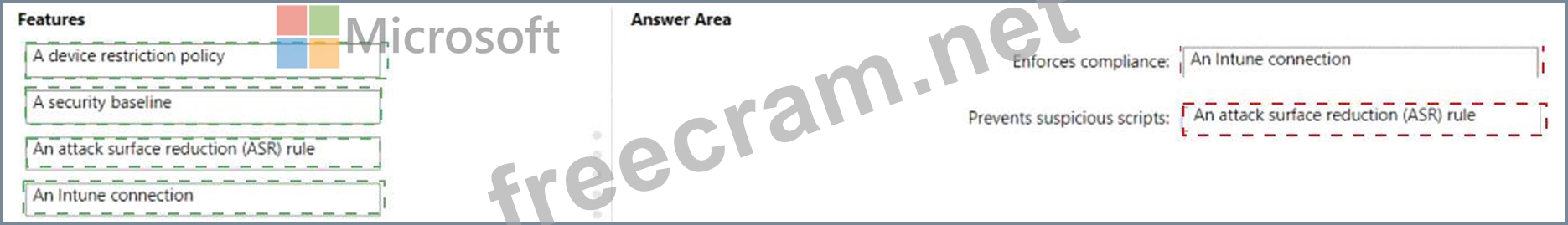You can then use Conditional Access policies to block or allow access to cloud apps based on the device compliance status. References: https://docs.microsoft.com/en-us/windows/security/threat-protection/microsoft- defender-atp/conditional-access To prevent suspicious scripts from running on devices, you need to configure an attack surface reduction (ASR) rule in Intune. ASR rules are part of the endpoint protection settings that you can apply to devices by using device configuration profiles. You can use the ASR rule "Block Office applications from creating child processes" to prevent Office applications from launching child processes such as scripts or executables.
