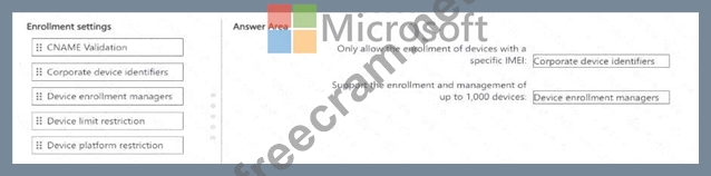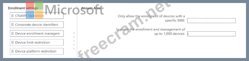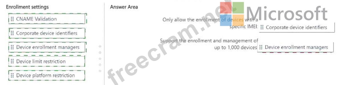 Which enrollment setting should you configure for each requirement? To answer, drag the appropriate settings to the correct requirements. Each setting may be used once, more than once, or not at all. You may need to drag the split bar between panes or scroll to view content.