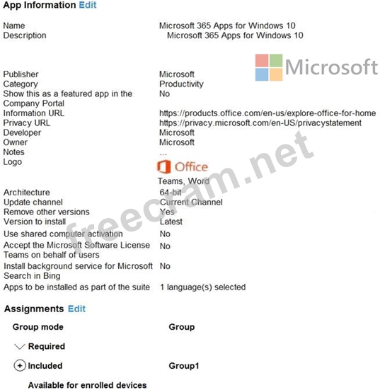 In the Microsoft Endpoint Manager admin center, you create a Microsoft 365 Apps app as shown in the exhibit. (Click the Exhibit tab.)