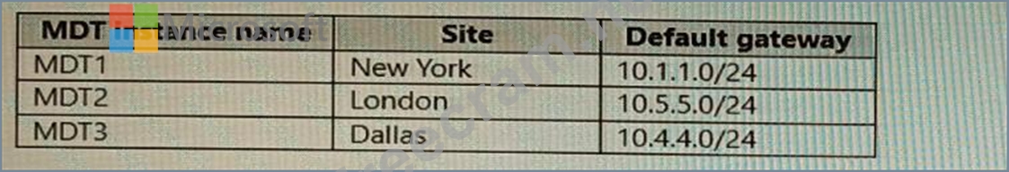 You have the Microsoft Deployment Toolkit (MDT) installed in three sites as shown in the following table.