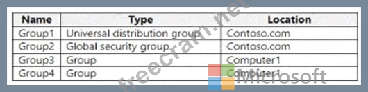 Your network contains an Active Directory domain named contoso.com. The domain contains a computer named Computer1 that runs Windows 10. You have the groups shown in the following table.