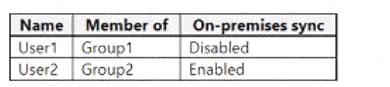 Your network contains an on-premises Active Directory Domain Services (AD DS) domain that syncs with an Azure AD tenant. The tenant contains the users shown in the following table.