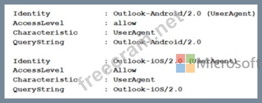 You run Get-ActiveSyncDeviceAccessRule | f1 Identity, AccessLevel, Characteristic, QueryString and you receive the following output.