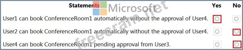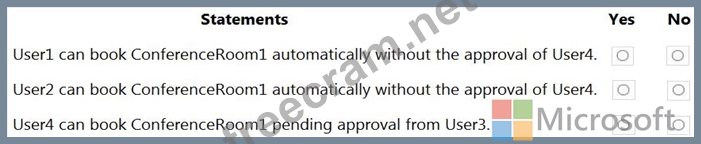 The BookInPolicy allows the Managers group. User2 is not in the Managers group so User 2 cannot book ConferenceRoom1 automatically without the approval of User4.