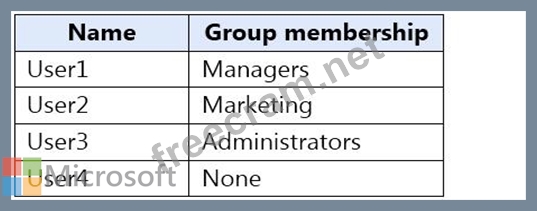 You have a Microsoft Exchange Online tenant that contains three Azure Active Directory (Azure AD) security groups named Administrators, Managers, and Marketing. The tenant contains the users shown in the following table.