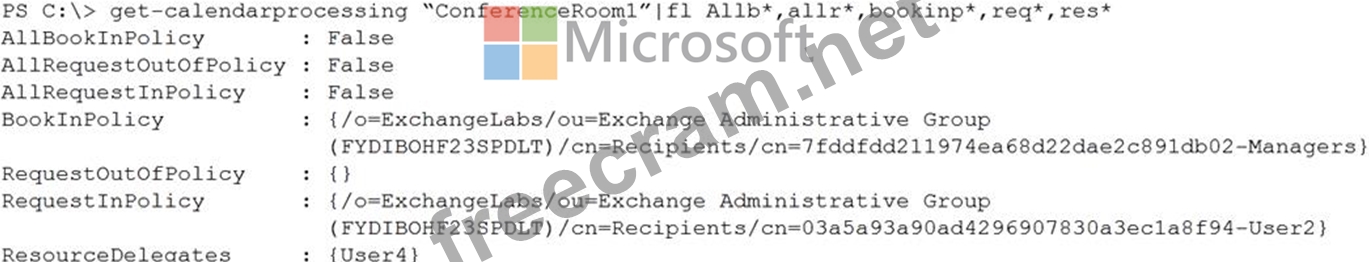 The BookInPolicy allows the Managers group. User1 is in the Managers group so User 1 can book ConferenceRoom1 automatically without the approval of User4.