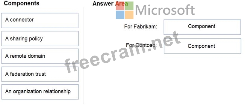 What should you configure? To answer, drag the appropriate components to the correct companies. Each component may be used once, more than once, or not at all. You may need to drag the split bar between panes or scroll to view content.