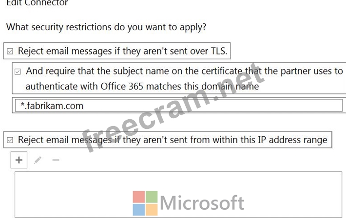 Email messages from a remote domain named fabrikam.com are received from a server that uses a wildcard certificate for fabrikam.com and are encrypted by using TLS.