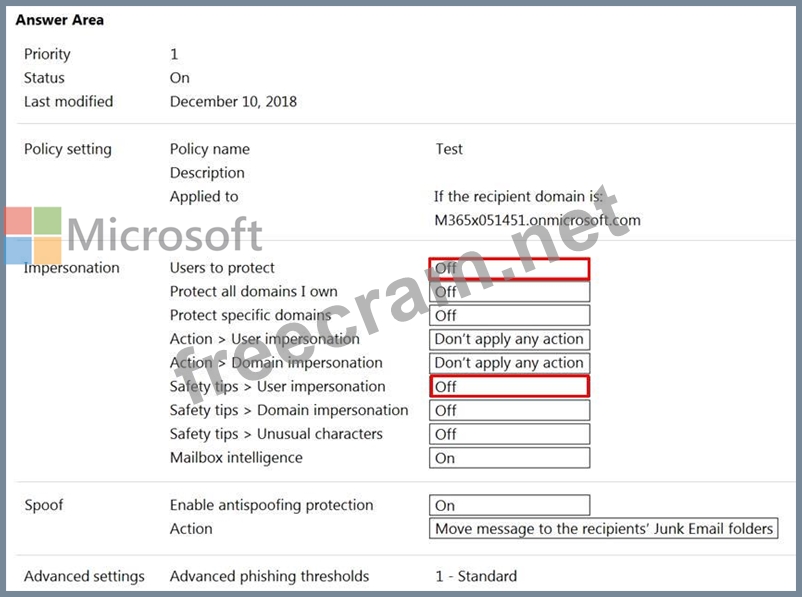 Which two settings should you modify in the anti-phishing policy? To answer, select the appropriate settings in the answer area.