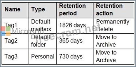 Policy1 is assigned to all users and contains the retention tags shown in the following table.