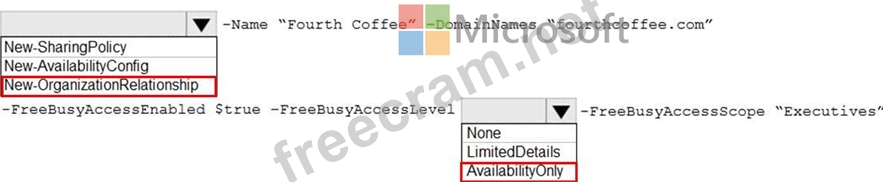 You need to ensure that the users at your company share free busy information with the users at Fourth Coffee. The solution must ensure that the meeting details included in the calendars of your company users remain hidden from the Fourth Coffee users.