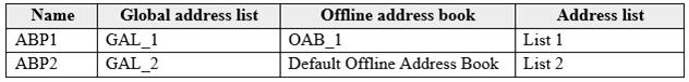 You have the Address Book Policies (ABP) and address lists in the following table.