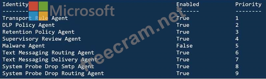 You run the Get-TransportAgent cmdlet and receive the output shown in the following exhibit.
