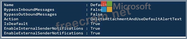 Get-MalwareFilterPolicy | FL Name,BypassInboundMessages,BypassOutboundMessages,Action,IsDefault You receive the output shown in the following exhibit.