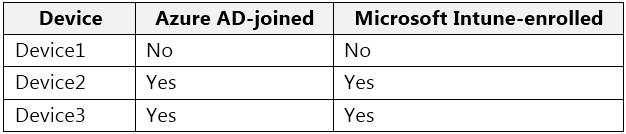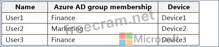You have a Microsoft 365 E5 tenant that contains two Azure Active Directory (Azure AD) security groups named Finance and Marketing. The tenant contains the users and devices shown in the following table.