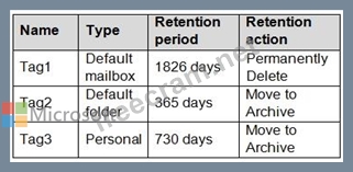 Policy1 is assigned to all users and contains the retention tags shown in the following table.