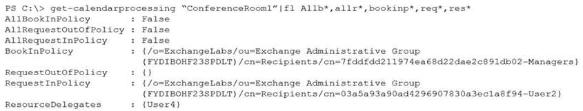 The BookInPolicy allows the Managers group. User1 is in the Managers group so User 1 can book ConferenceRoom1 automatically without the approval of User4.