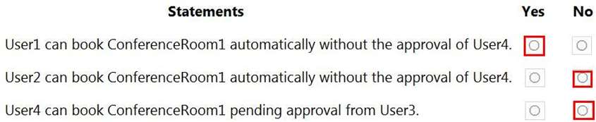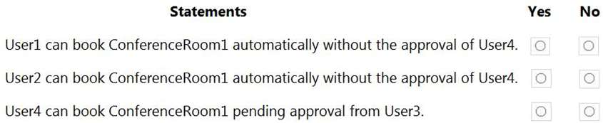 The BookInPolicy allows the Managers group. User2 is not in the Managers group so User 2 cannot book ConferenceRoom1 automatically without the approval of User4.