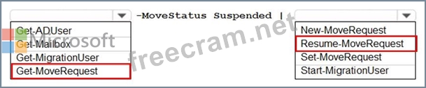Which PowerShell command should you run to complete all the suspended mailbox migrations? To answer, select the appropriate options in the answer area.