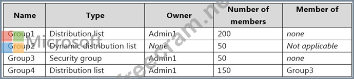 You have a Microsoft Exchange Online tenant that contains the groups shown in the following table.