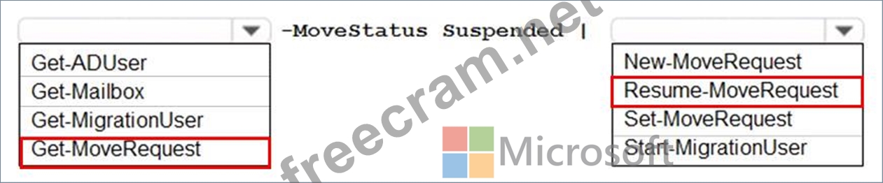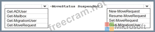 Which PowerShell command should you run to complete all the suspended mailbox migrations? To answer, select the appropriate options in the answer area.