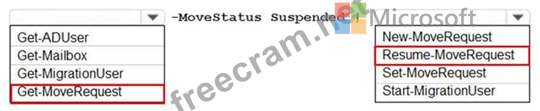 Which PowerShell command should you run to complete all the suspended mailbox migrations? To answer, select the appropriate options in the answer area.