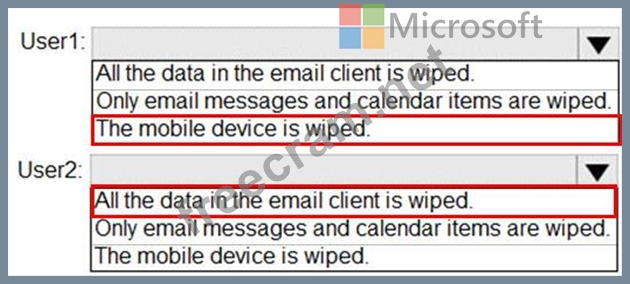 From the Exchange admin center, you issue a Wipe Data command for User1 and User2.