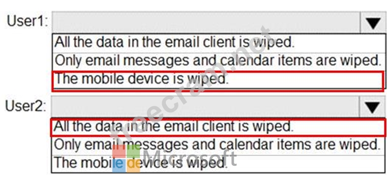From the Exchange admin center, you issue a Wipe Data command for User1 and User2.