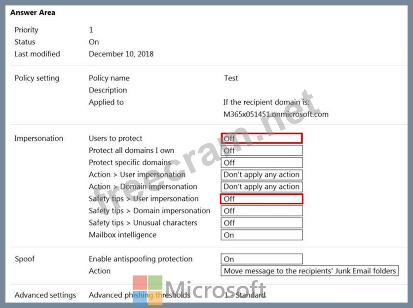 Which two settings should you modify in the anti-phishing policy? To answer, select the appropriate settings in the answer area.
