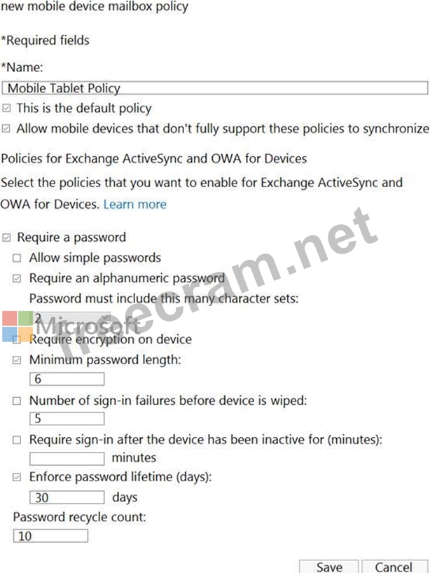 You create a new mobile device mailbox policy as shown in the following exhibit.