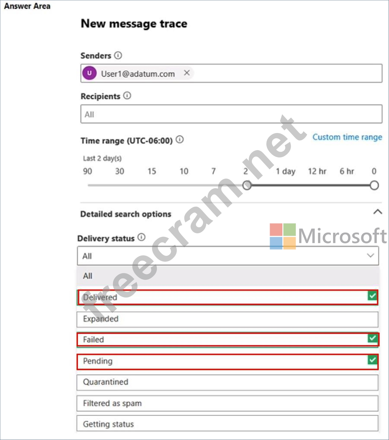Which three Delivery status options can be included in the report? To answer, select the appropriate options in the answer area.