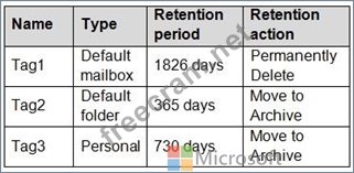 Policy1 is assigned to all users and contains the retention tags shown in the following table.