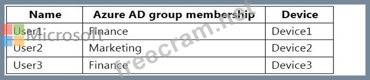 You have a Microsoft 365 E5 tenant that contains two Azure Active Directory (Azure AD) security groups named Finance and Marketing. The tenant contains the users and devices shown in the following table.