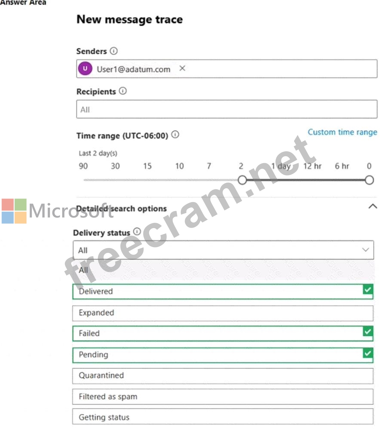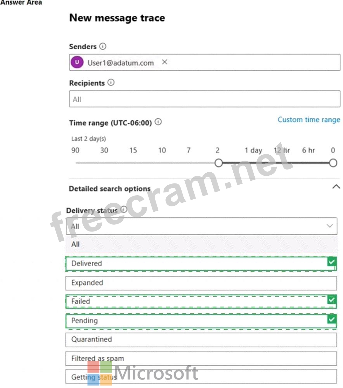 Which three Delivery status options can be included in the report? To answer, select the appropriate options in the answer area.